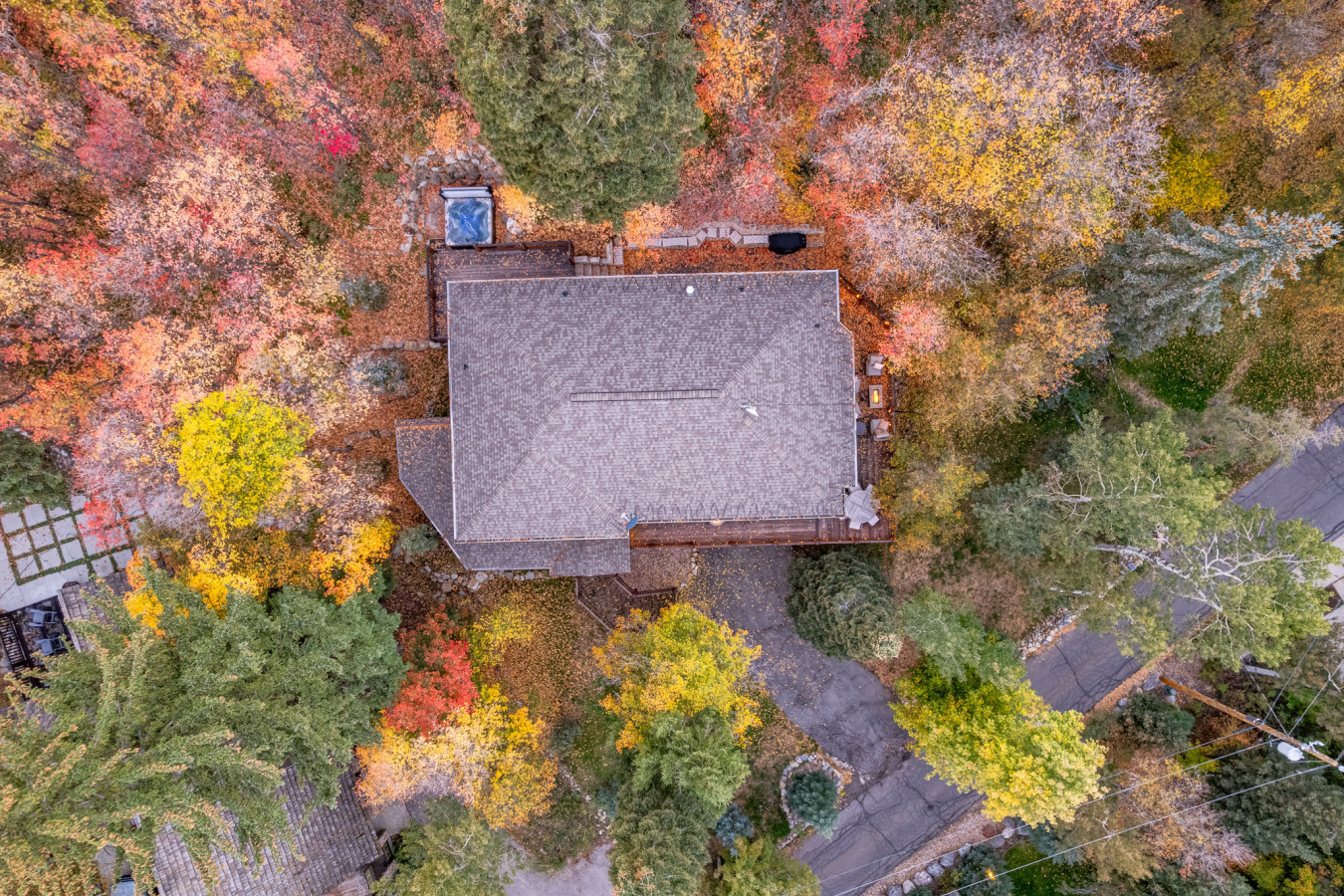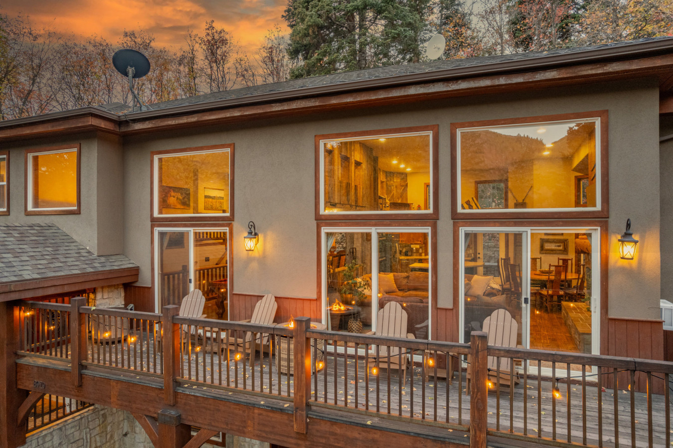 The home is set back from the road and offers large wrap around decks on three sides for year-round enjoyment of the beautiful woods and mountains. The front offers a small yard for snowball fights.