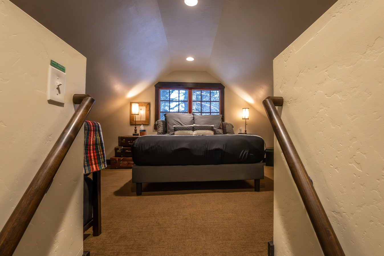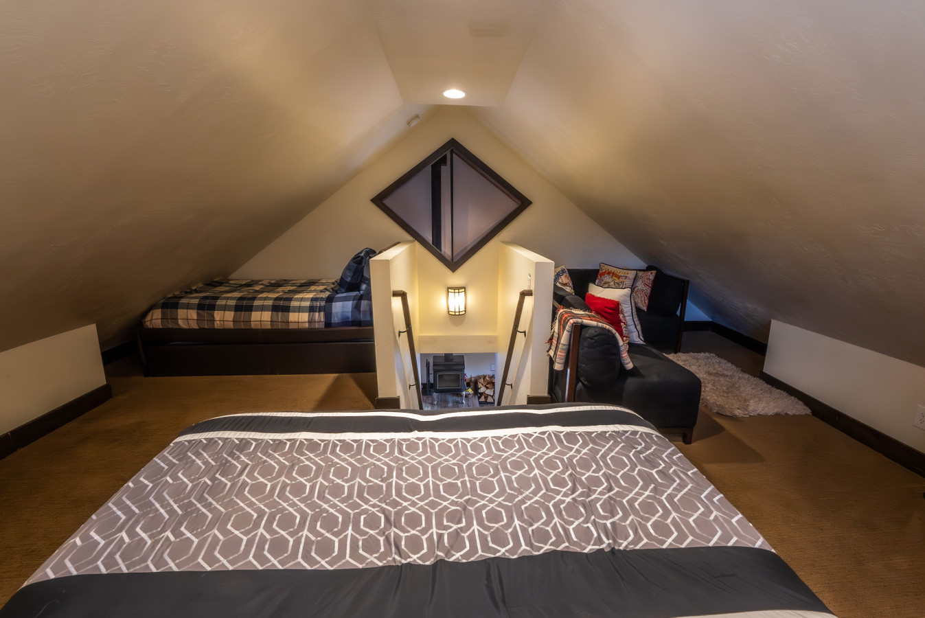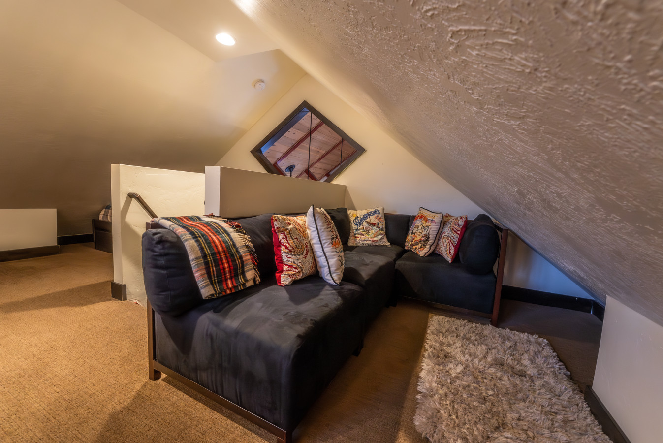 Upstairs has a queen bed and couches tucked in nooks to chill