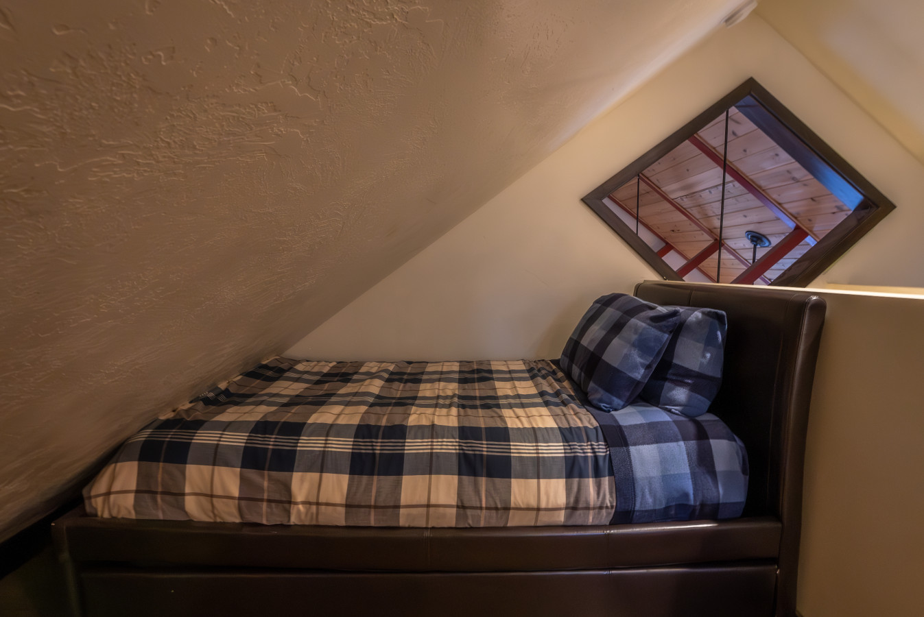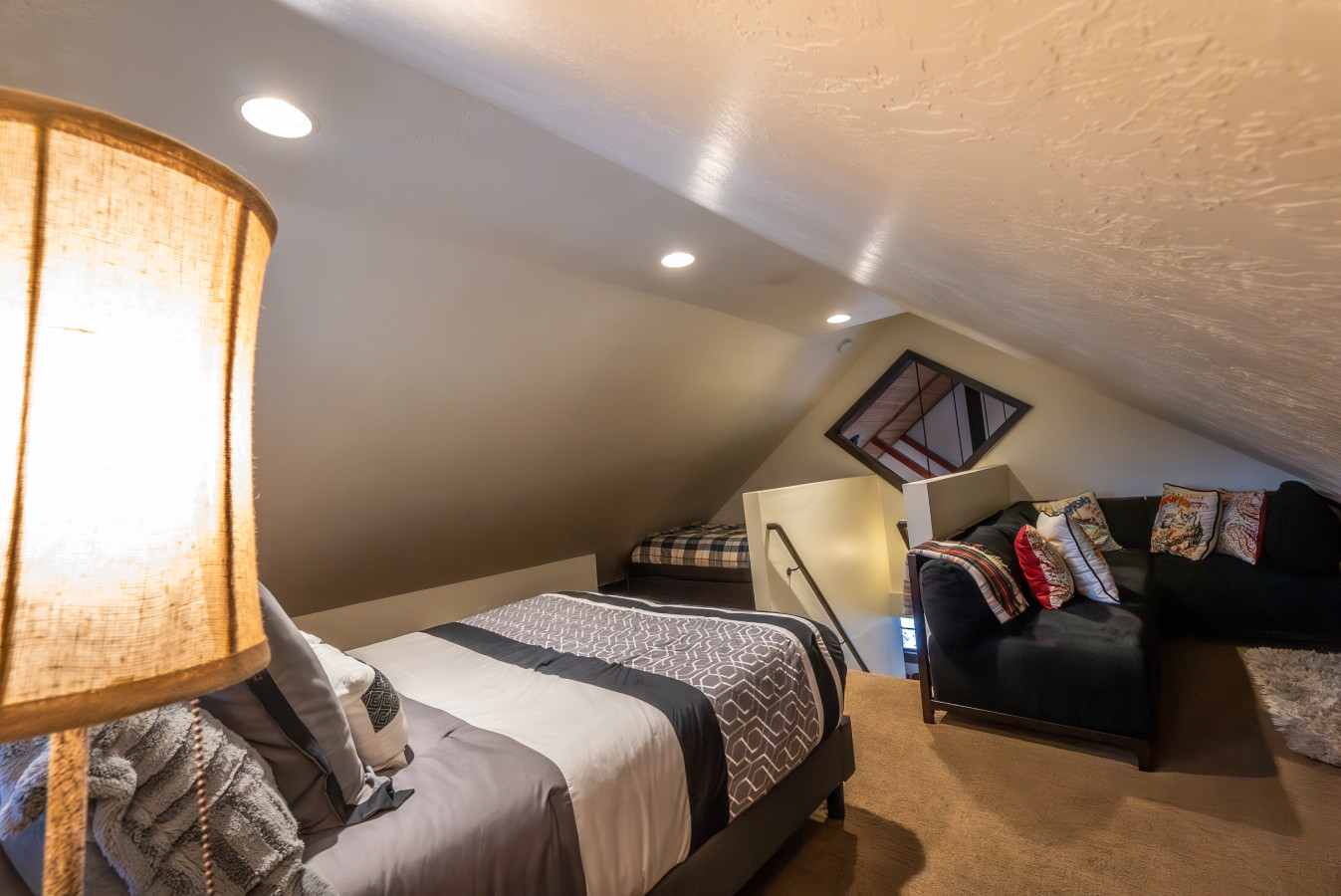 Upstairs room has no door, queen bed, trundle bed with two twin mattresses, and couches to chill