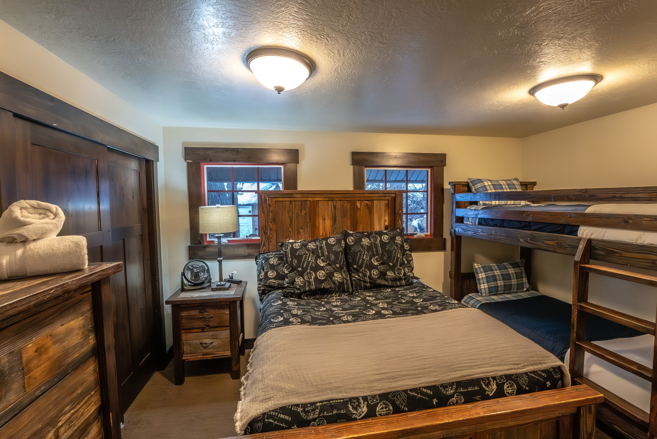 Main level has hall bathroom and one bedroom has a queen bed and twin bunk beds