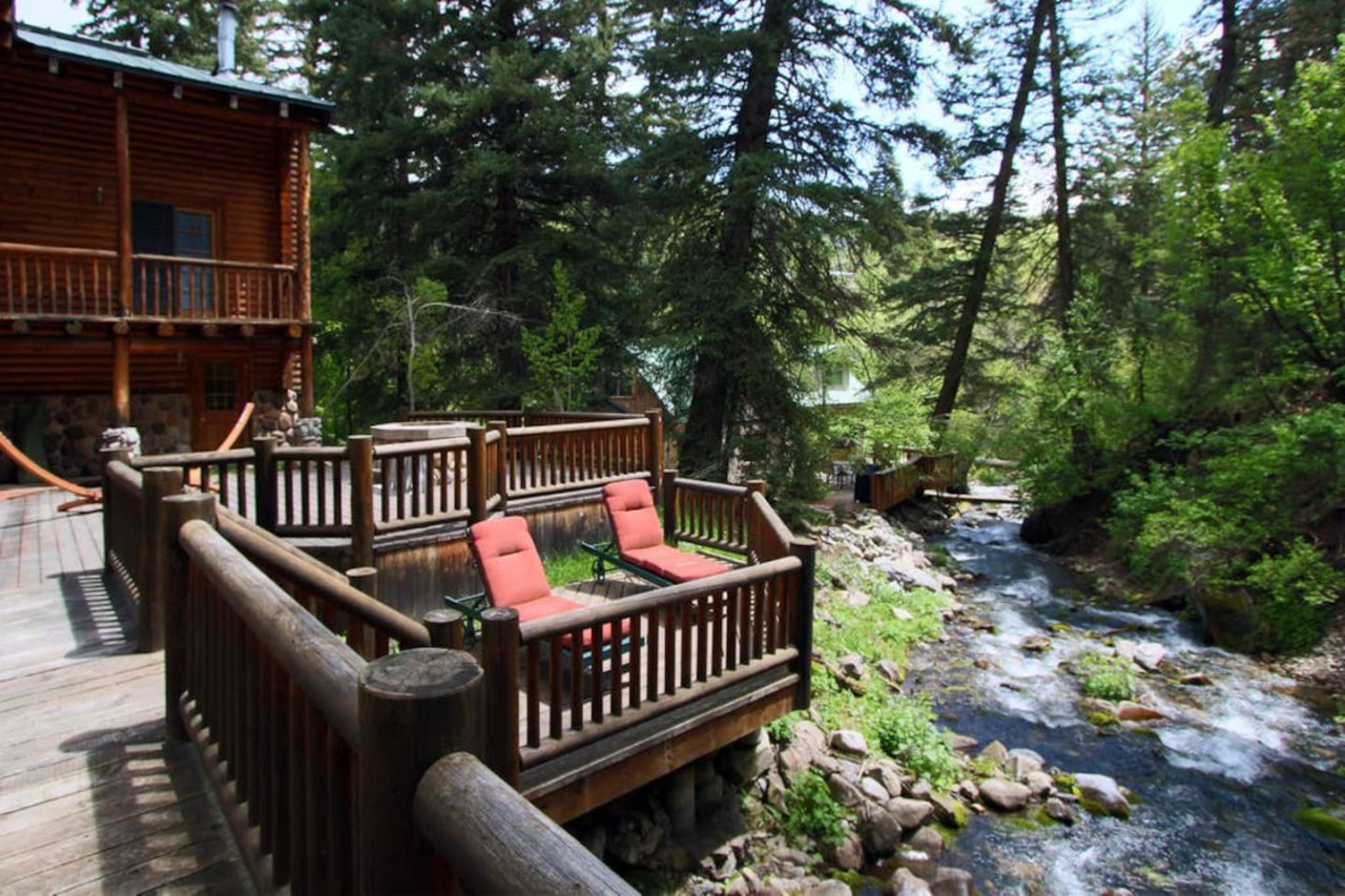 A large living room with wood burning stove, large kitchen with island, dining area, 5 bedrooms, 3 bathrooms, a Man Cave, hot tub, and lots of decks for lounging and listening to the stream rush past.