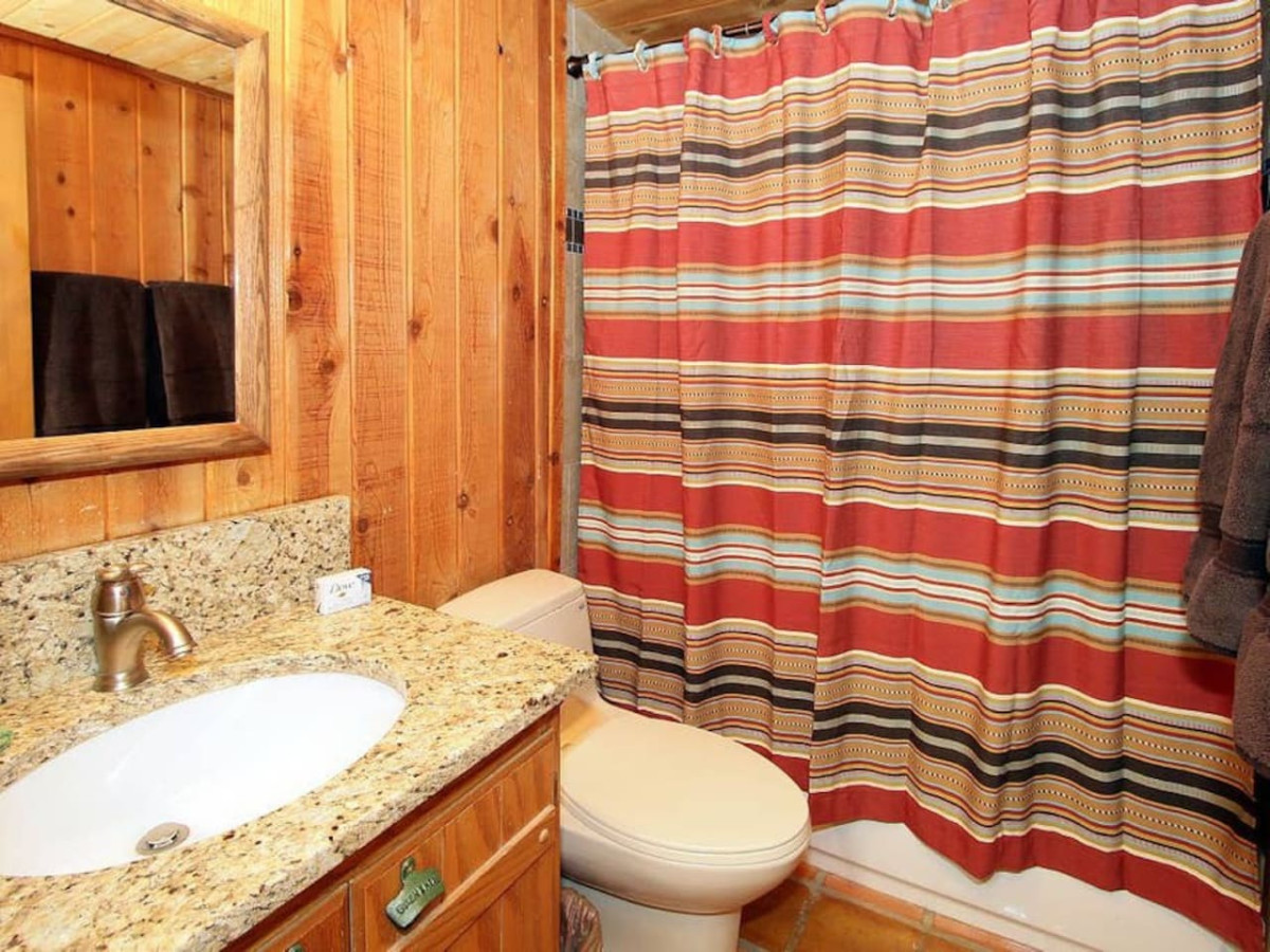 Downstairs has one bathroom, one bedroom with two queen beds, one bedroom with two twin beds, and is adjacent to the exterior door on ground level, one large bedroom with California King, tv, two chairs and exterior door leading to the hot tub, and of course the Man Cave complete with pool table, card table, pinball and doors leading to the lower decks and stream.