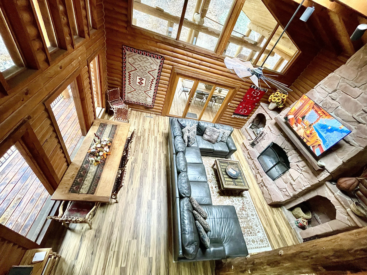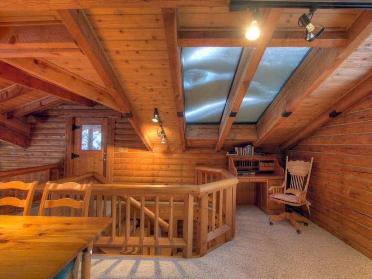 The upstairs bedroom has a queen bed, bathroom with tub, and skylights for night gazing plus a twin trundle bed that sleeps two. A private balcony leads to the upper deck.