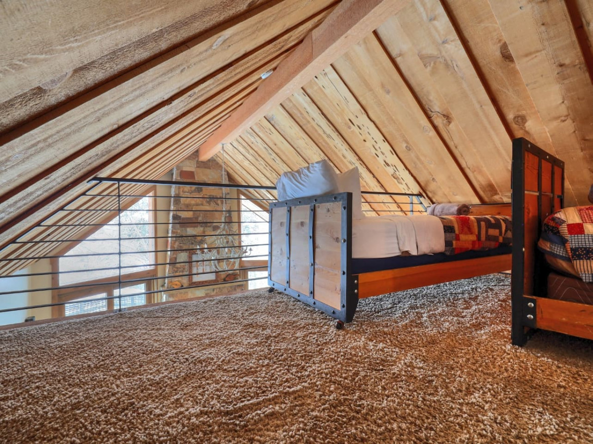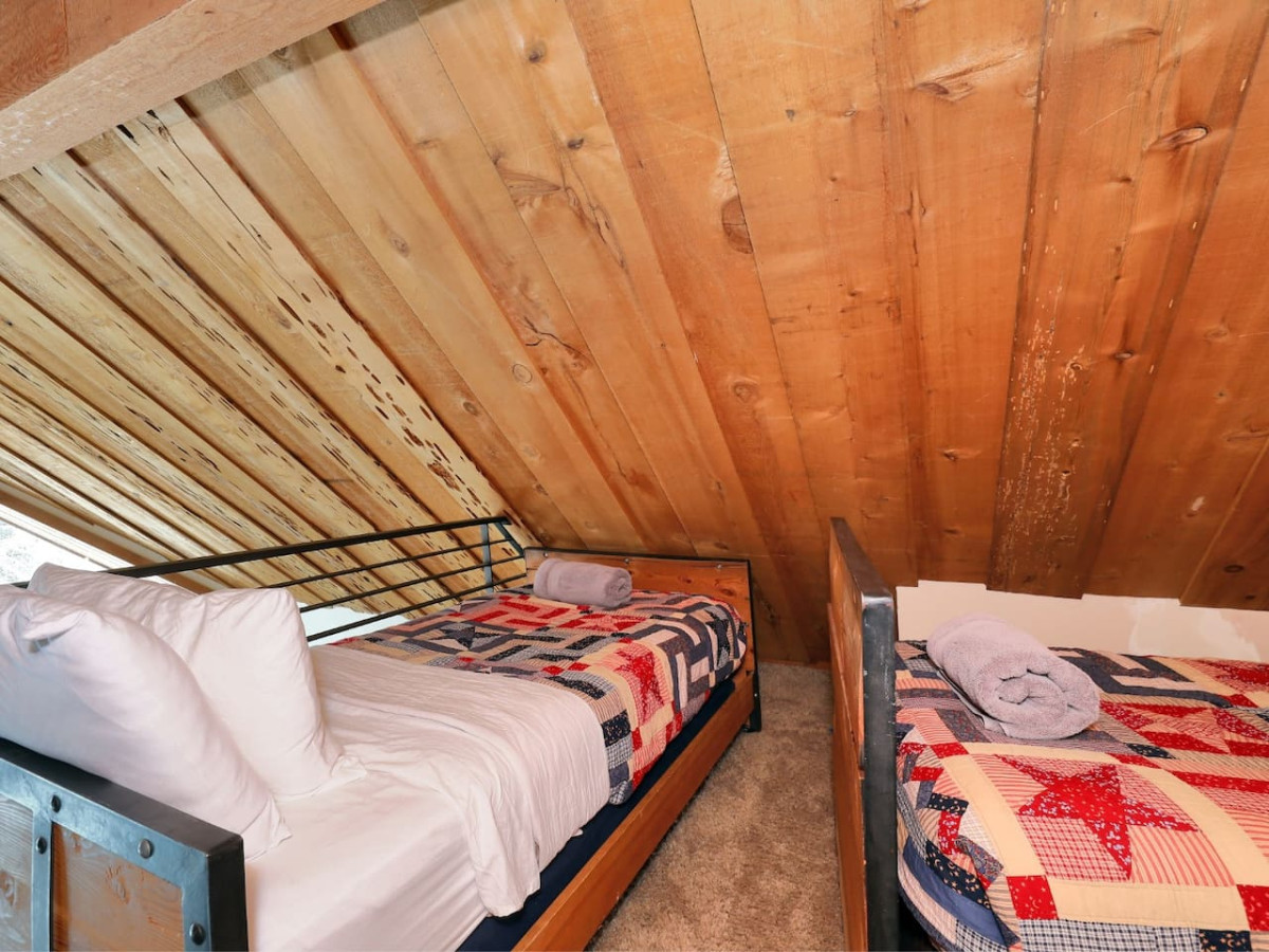 Upstairs has one bathroom, one private queen bedroom, an open bunk room with 4 twin beds, and a “kid size” passageway to another open sleeping loft with two twin beds