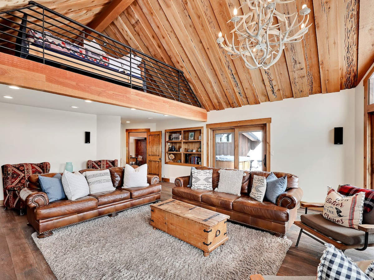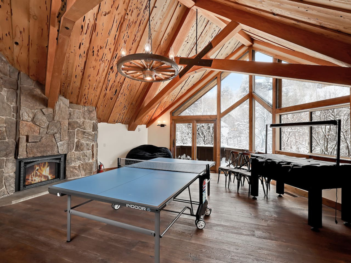 A large, open playroom offers shuffleboard, ping pong table, foosball, and arcade games. The spacious and fully stocked kitchen has everything you need to make a big meal and enjoy on a large solid wood dining table, the living room has plentiful couches and chairs for lounging. Opening up the doors to the deck, take a dip in the hot tub and you’ll be surrounded by trees.