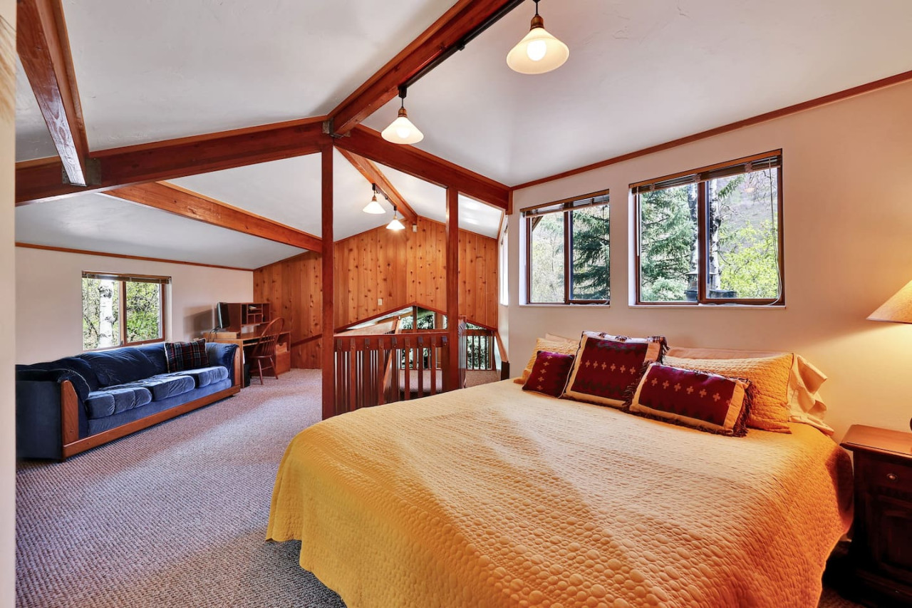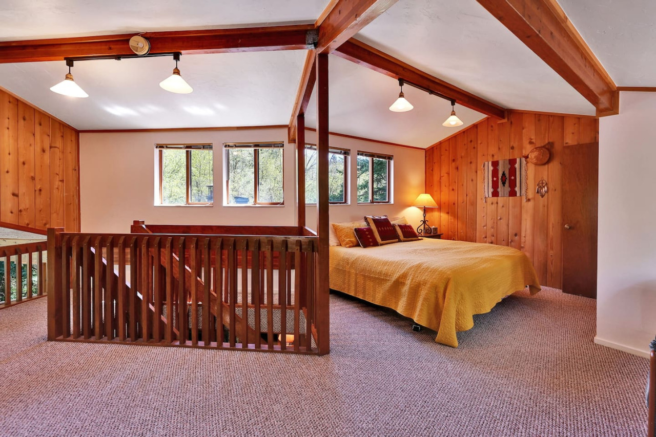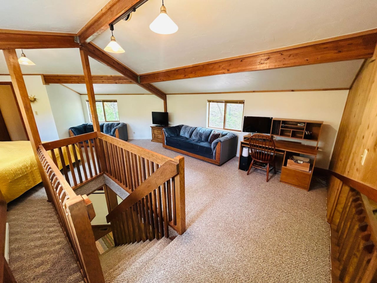 Up the staircase is a sleeping loft with one queen bed, a sofa, computer desk, and a half-bathroom.