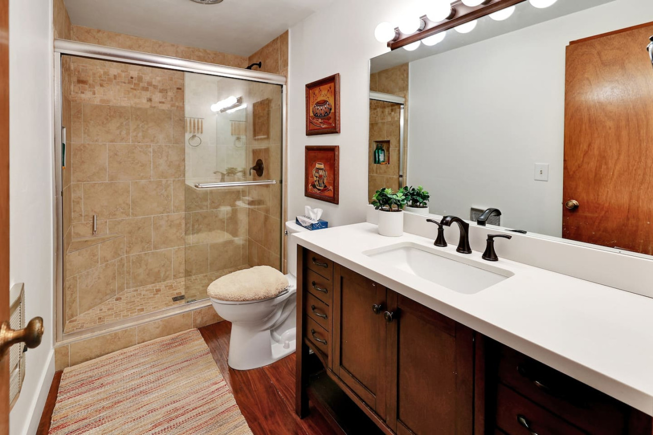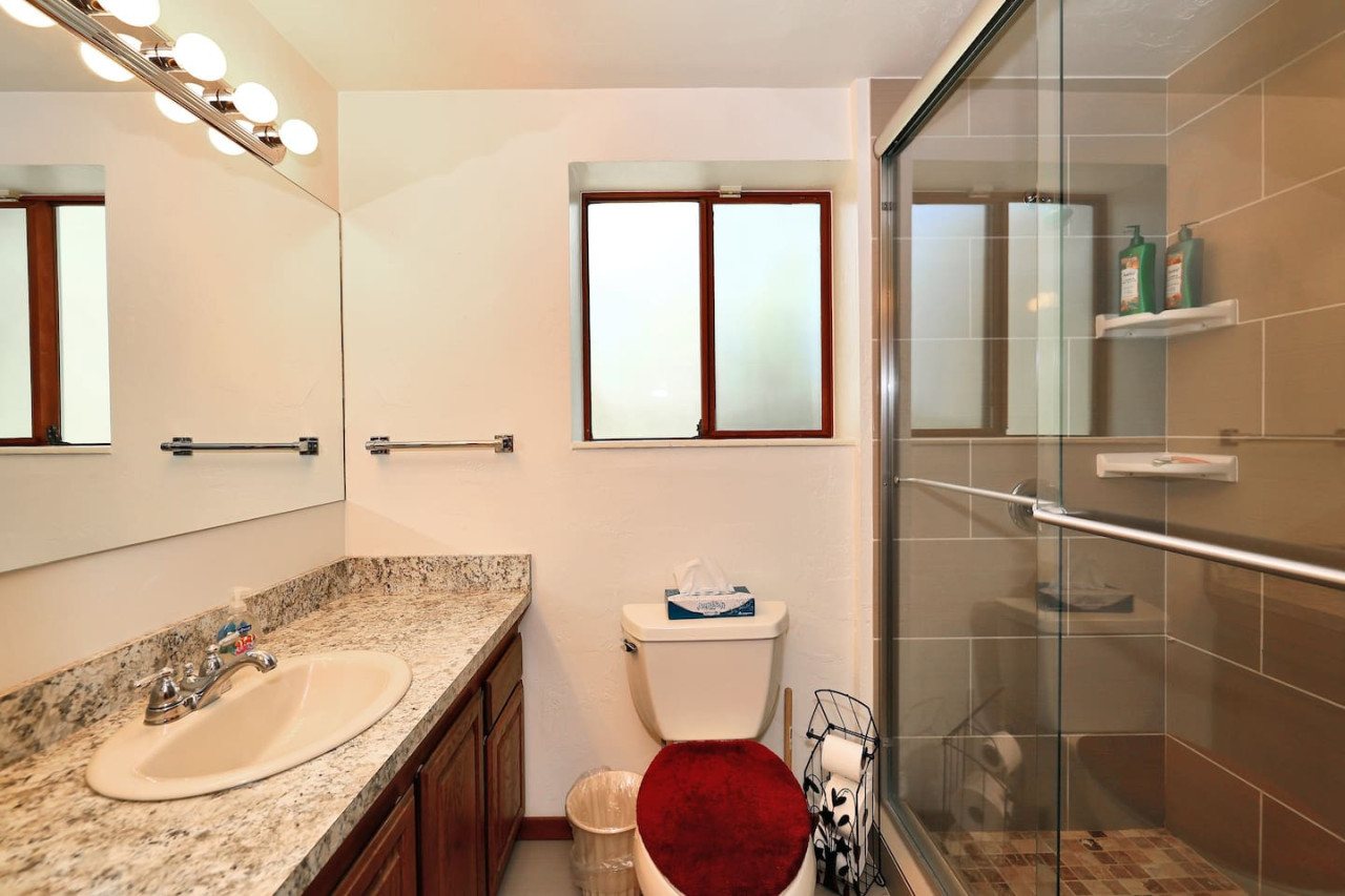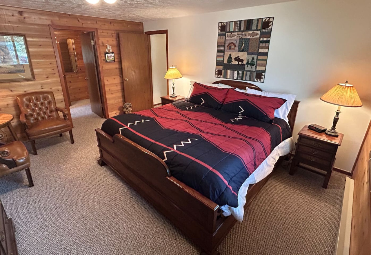 Main floor has a hall bathroom and two bedrooms with queen beds, and a master bedroom with king bed and bathroom.