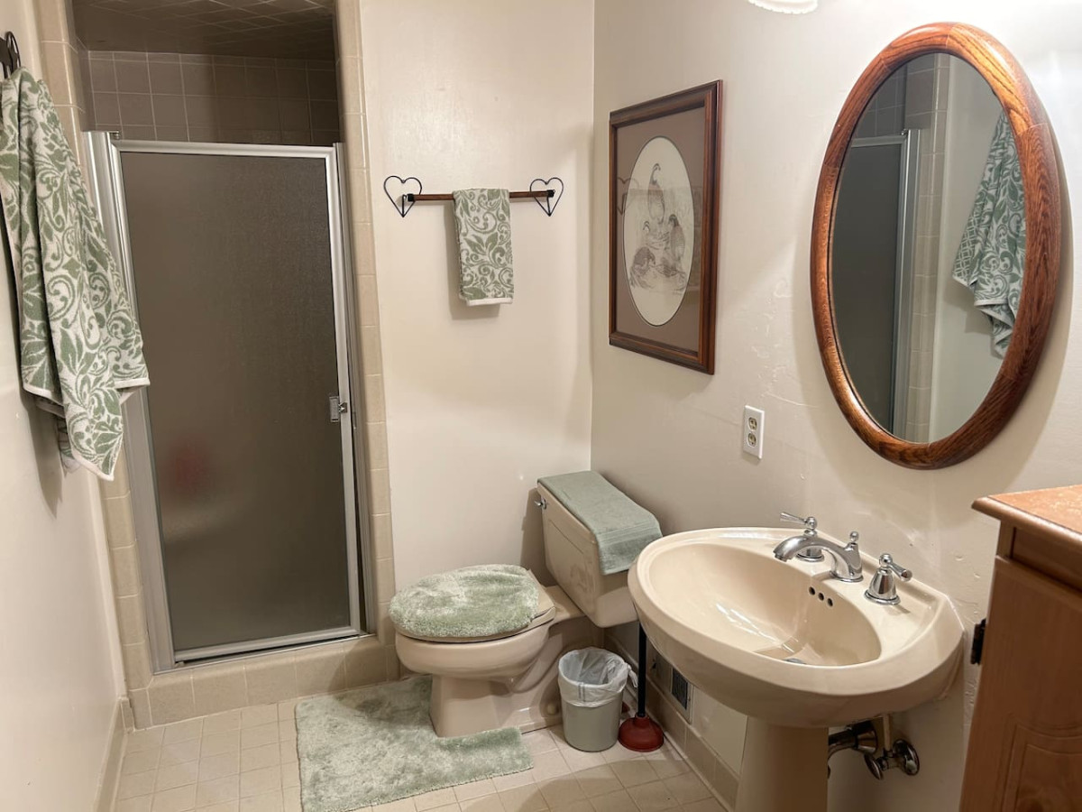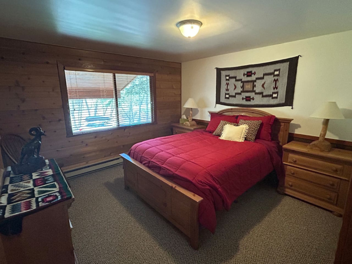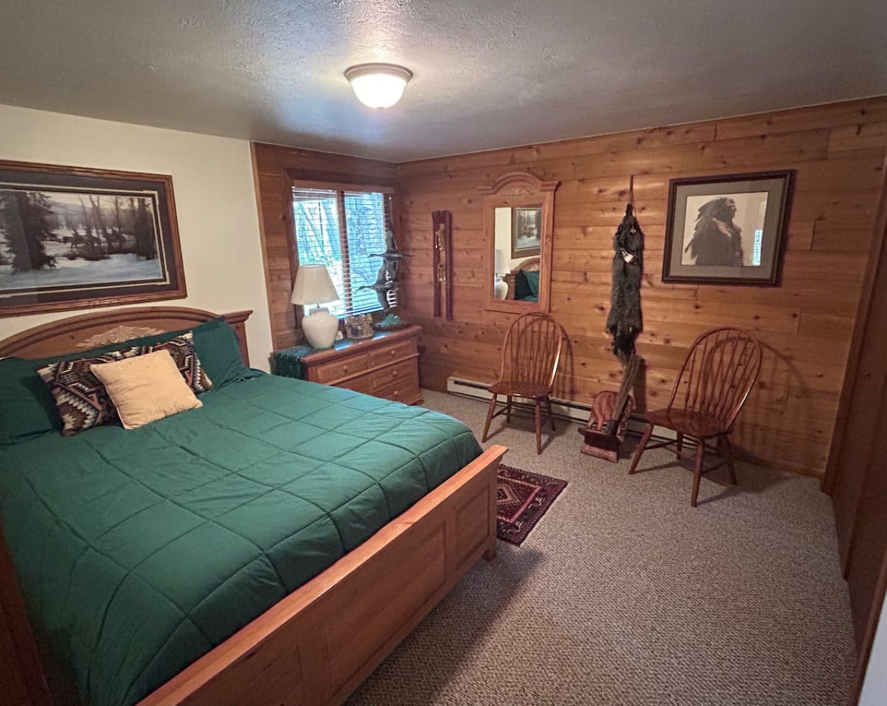Downstairs has a hall bathroom and one bedroom with a king bed.