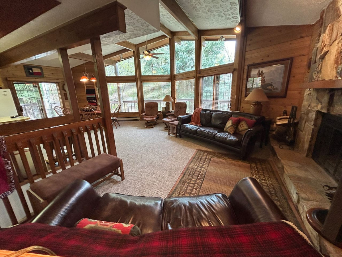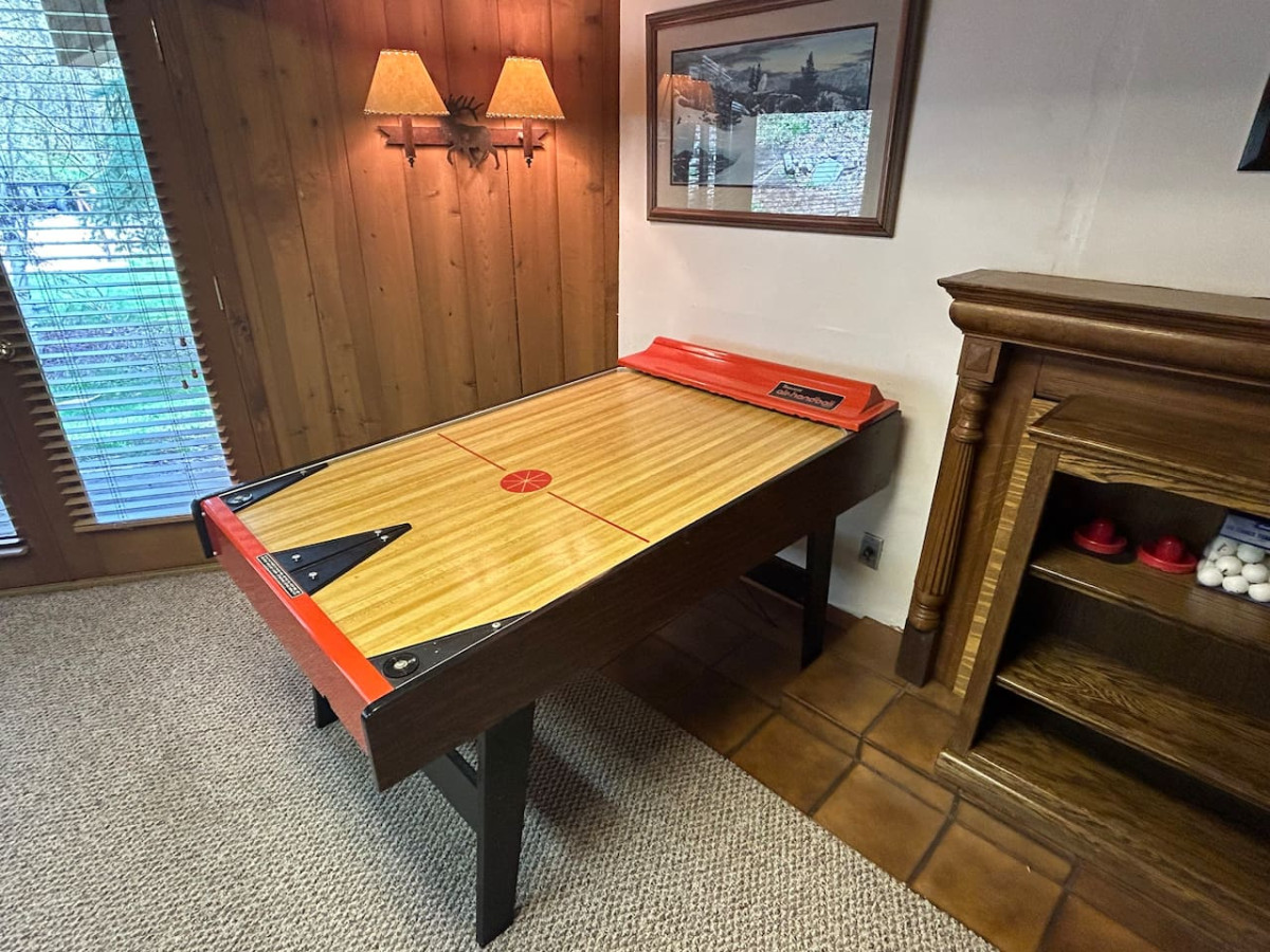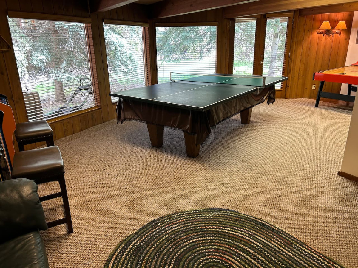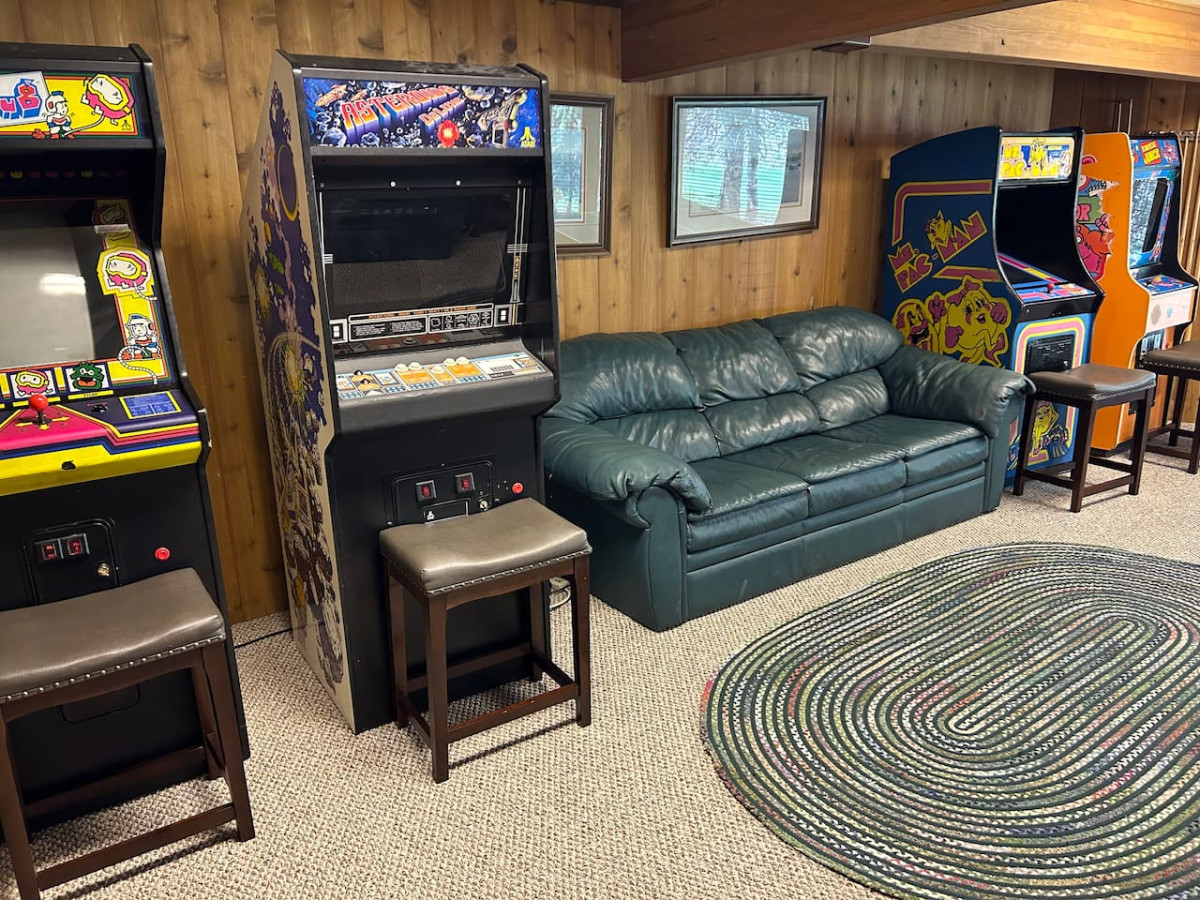 It's easy to gather generations here. The walk out, ground level has an impressive game room with full size arcade games (DigDug, Asteroids Deluxe, Ms. Pac-Man, and Donkey Kong Junior), ping pong, and pool table for the kids to enjoy. The main level has a roomy living room for lounging with a book, a large kitchen with island for meals together, beautiful dining table, and an outside deck overlooking the tall pines and large yard.