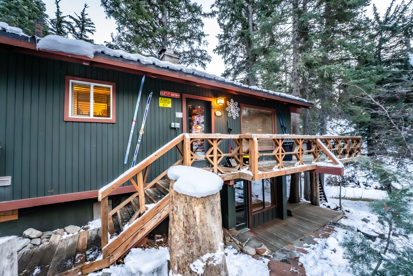 The Treehouse has two separate levels and entrances and works great for two families with kids who want their own space. The upper level is a bit larger than downstairs, complete with living room, wood burning stove, large windows and doors to the main deck, dining room, full kitchen, two bedrooms, and a hall bathroom. A door from the kitchen leads out to the upper deck with a grill and stairs down to the hot tub. The downstairs offers a living room, queen bedroom with bathroom, kitchenette, and doors to the ground level patio. A one of a kind place, there are lots of things to do here: walk to the edge of the stream and cool your feet, lounge in the grass, and watch chipmunks in the trees and clouds in the sky. In winter have a snowball fight and make snow angels. Any season, it’s picture perfect.